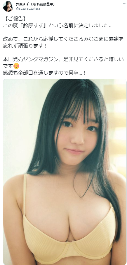 ホリプロの大型新人JK鈴原すず、爆乳水着グラビアデビュー!“名前募集中”だった高校2年生が「ヤンマガ」でメディア初登場!プロフィール、画像、動画まとめ グラビアアイドル・水着姿 X Facebook はてブ LINE コピー 2023.01.30 スポンサーリンク 伸びしろ未知数の新人女子高生!芸名を一般公募していた高校2年生・鈴原すず(17)が、2023年1月30日発売のマンガ誌「週刊ヤングマガジン」で、初水着グラビアを披露しました。 鈴原すずのプロフィール、ヤンマガの初水着グラビア画像&メイキング動画をまとめました。 続きを読む