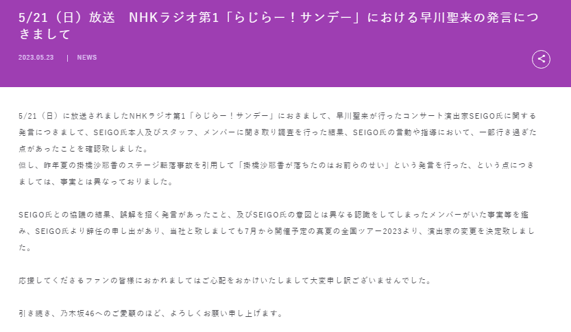 ※追記:乃木坂46公式サイトがSEIGO氏の辞任を発表