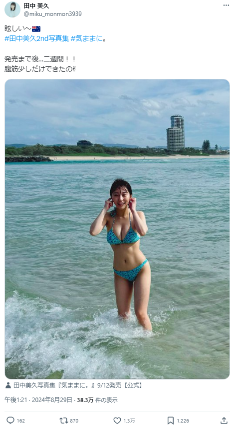 HKT48卒業後、女優としてもグラビアアイドルとしても大活躍の田中美久(22)が、2024年8月29日、自身のX(旧Twitter)を更新。「腹筋少しだけできたの✌︎」のコメントとともに、9月12日発売のセカンド写真集『気ままに。』からビキニ姿のカットを公開すると、肉感的かつ引き締まった見事なボディに称賛の声が寄せられていました。