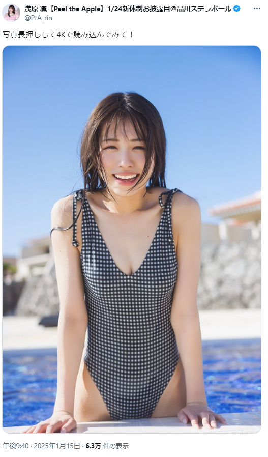 【画像】超絶美少女アイドル、人生初の水着姿が可愛すぎるwwwwwww浅原凜、1st写真集から胸キュン必至な4K先行カット解禁!!! グラビアアイドル・水着姿 X Facebook はてブ LINE コピー 2025.01.15 スポンサーリンク アイドルグループ「Peel the Apple」のセンター・浅原凜(22)が、2025年2月10日、人生初めての水着やランジェリーカットに挑戦した1st写真集『凜』を発売します。 発売に先駆け、水着姿で胸の谷間をチラ見せした先行カットが本人の公式Xで公開されました。 浅原凜のプロフィール、1st写真集『凜』の先行カット画像をまとめました。 続きを読む
