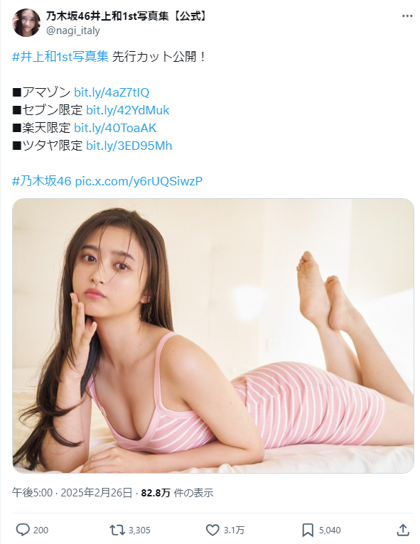 【画像】乃木坂46井上和、おっぱいを過去最高露出wwwwwwww1st写真集から胸の谷間カットがまたまた解禁!!! 乃木坂46 X Facebook はてブ LINE コピー 2025.02.26 スポンサーリンク 乃木坂46の5期生・井上和(いのうえ なぎ=20歳)が、2025年4月22日、水着や初ランジェリーに挑戦した1st写真集を講談社から発売します。 発売に先駆け、ピンクの縞々ワンピース姿で胸の谷間を大胆に露出した先行カットが解禁され、3万件超の「いいね!」が寄せられていました。 井上和のプロフィール、1st写真集のオフショット、5期生写真集『あの頃、乃木坂にいた』から初水着カット画像をまとめました。 続きを読む