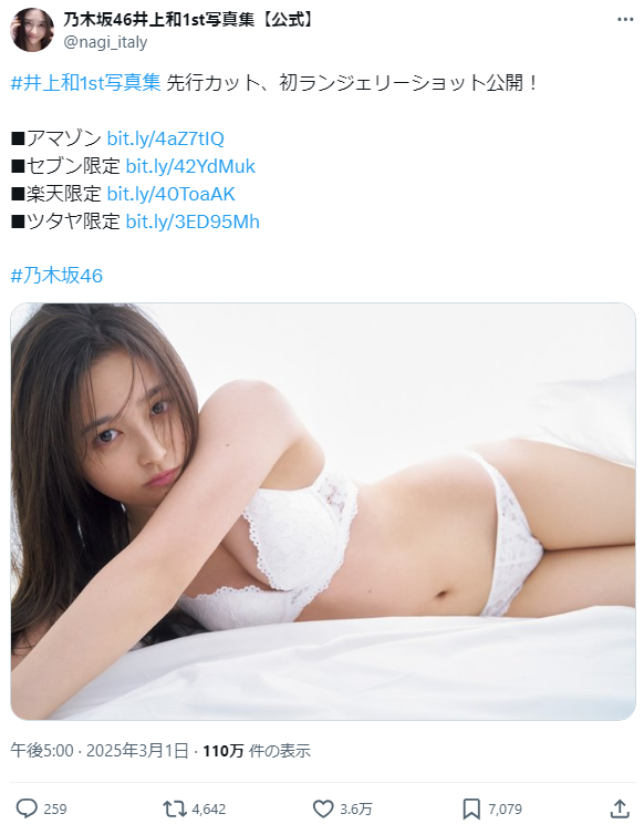 【下着画像】乃木坂46井上和、ランジェリー姿を解禁wwwwww1st写真集からエッチな先行カットが公開されファン大興奮!!! 乃木坂46 X Facebook はてブ LINE コピー 2025.03.01 スポンサーリンク 乃木坂46の5期生・井上和(いのうえ なぎ=20歳)が、2025年4月22日、水着や初ランジェリーに挑戦した1st写真集を講談社から発売します。 発売に先駆け、初ランジェリー姿の先行カットが解禁され、シーツ上で見せた美乳にファンから興奮の声が殺到。3万件超の「いいね!」が寄せられていました。 井上和のプロフィール、1st写真集の先行カット、5期生写真集『あの頃、乃木坂にいた』から初水着カット画像をまとめました。 続きを読む