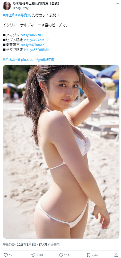 【衝撃画像】乃木坂46井上和、極小ビキニ姿を解禁wwwwwww1st写真集の水着カットが攻めすぎてると話題に!!! 乃木坂46 X Facebook はてブ LINE コピー 2025.03.05 スポンサーリンク 乃木坂46の5期生・井上和(いのうえ なぎ=20歳)が、2025年4月22日、水着や初ランジェリーに挑戦した1st写真集を講談社から発売します。 発売に先駆け、水着姿の先行カットがついに解禁され、イタリア・サルディーニャ島のビーチで撮影された純白のビキニ姿に対し、ファンは「布面積が小さすぎる」と衝撃を受けていました。 井上和のプロフィール、1st写真集の先行カット、5期生写真集『あの頃、乃木坂にいた』から初水着カット画像をまとめました。 続きを読む