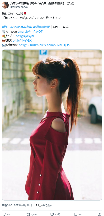 【画像】乃木坂46筒井あやめ、ロケット乳の破壊力がヤバすぎるwwwwww長い首と美しい横顔よりも突出した胸に注目!!! グラビアアイドル・水着姿 X Facebook はてブ LINE コピー 2025.04.16 スポンサーリンク 日本を代表するアイドルグループ『乃木坂46』の4期生・筒井あやめ(22)が、2025年6月3日、水着やランジェリーに初挑戦した1st写真集『感情の隙間』を光文社から発売します。 発売に先駆け、写真集の公式Xは『「首ンセス」の名にふさわしい1枚です』のコメントとともに、横からの写真を投稿すると、長い首と整った横顔はもちろん、主張するロケット乳にも注目が集まっていました。 筒井あやめのプロフィール、1st写真集の先行カッ画像をまとめました。 続きを読む