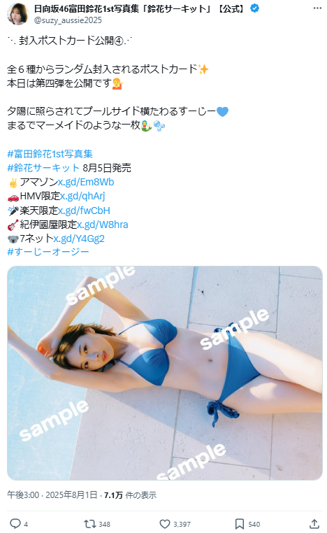 発売に先駆け、写真集に封入される特典ポストカードの絵柄第4弾が解禁されました。夕陽に照らされて水着でプールサイドに横たわり、まるでマーメイドのような一枚となっています。