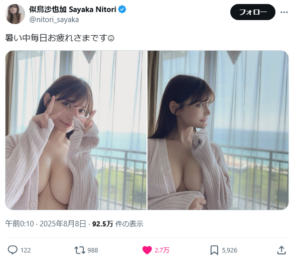 “インスタグラビアの女王”として知られ、インスタフォロワー110万人の似鳥沙也加(にとり・さやか=31歳=Gカップ)が、2025年8月8日、自身の公式X(旧Twitter)を更新。「暑い中毎日お疲れさまです☺︎」のコメントとともに、ノーブラでニットを羽織った大胆なグラビアオフショットを投稿すると、3万件近くの「いいね!」が寄せられていました。