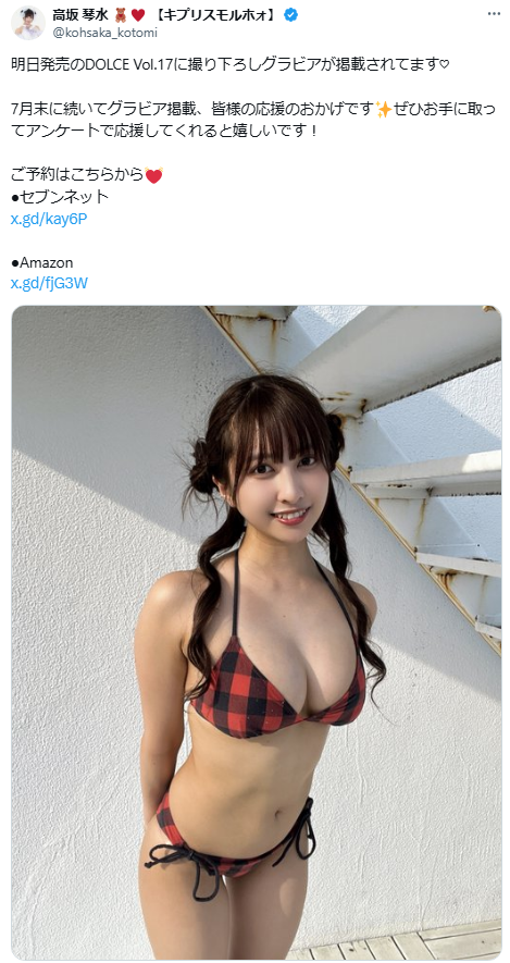 アイドルグループ「キプリスモルホォ」のキャプテンを務めるスパニッシュ系ハーフ美女・高坂琴水(25)が、2025年8月6日、自身の公式X(旧Twitter)を更新。発売中の雑誌「DOLCE Vol.17」で披露した水着グラビアのオフショットを投稿すると、セクシーな変形水着姿にファンから興奮の声が殺到していました。