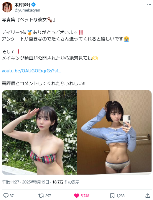 【画像】童顔巨乳界の超逸材ルーキー、Gカップ下乳を衝撃露出wwwwwww木村夢叶、ドスケベ自撮り写真が大反響!!! グラビアアイドル・水着姿 X Facebook はてブ LINE コピー 2025.08.23 スポンサーリンク 低身長×童顔巨乳界のニューヒロイン誕生!アイドルグループ「ゆめのうさぎ」のメンバー・木村夢叶(ゆめか=19歳=身長148cm)が、2025年8月19日、自身の公式X(旧Twitter)を更新。雑誌「週刊プレイボーイ」で披露した水着グラビアのオフショットを投稿すると、Gカップの下乳と美くびれを大胆に晒した写真にファンから興奮の声が殺到していました。 木村夢叶のプロフィール、週プレの最新水着グラビア&オフショット、前回の週プレグラビア画像をまとめました。 続きを読む
