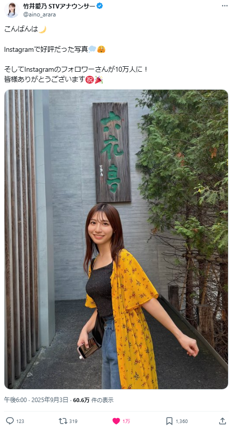 STV札幌テレビ放送(日本テレビ系列)の新人アナウンサー・竹井愛乃(22)が、2025年9月3日、自身の公式X(旧Twitter)を更新。「Instagramで好評だった写真💭🫣Instagramのフォロワーさんが10万人に!皆様ありがとうございます」のコメントとともに、グラマラスでスタイル抜群な写真を投稿すると、1万件超の「いいね!」が寄せられていました。