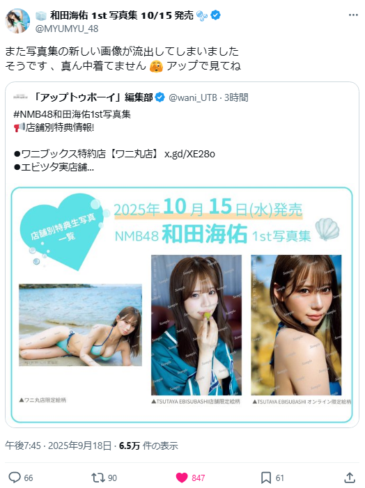 キュートなルックスと水着映えする抜群のスタイルを武器にグラビア界で人気爆発中のNMB48和田海佑(みゆ=28)が、2025年10月15日、ファースト写真集をワニブックスから発売します。