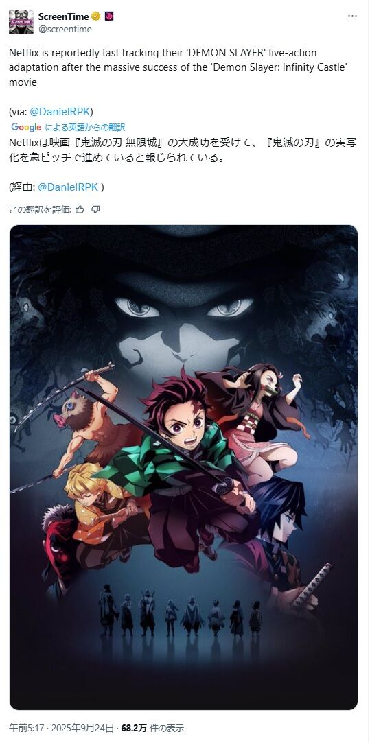 【速報】「鬼滅の刃」、世界中で大ヒットしたためNetflixで実写化を計画中か!? 鬼滅の刃 X Facebook はてブ LINE コピー 2025.09.25 スポンサーリンク 1: 2025/09/25(木) 【速報】鬼滅が世界中で大ヒットしたためネトフリが実写化の準備に入る2: 2025/09/25(木) タンジェロが黒人になってまう3: 2025/09/25(木) レンゴクサーン!4: 2025/09/25(木) いらんことすんな! 続きを読む