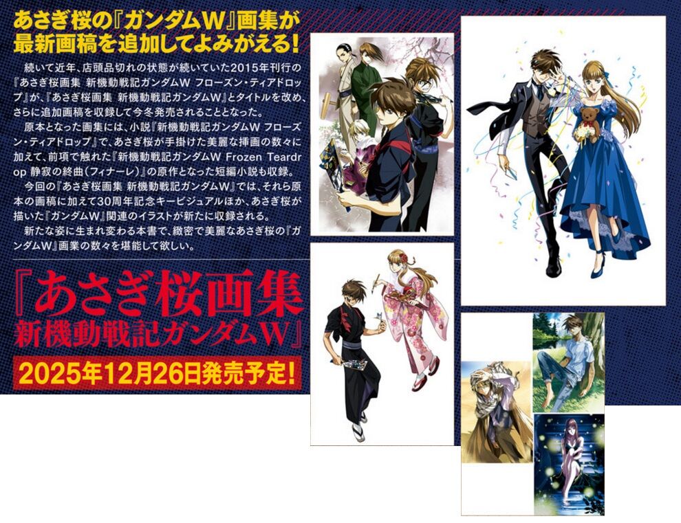 「あさぎ桜画集 新機動戦記ガンダムW」が予約開始!「W」30周年を彩る、あさぎ桜の千紫万紅のWキャラを見よ! アニメ・ゲーム関連情報 X Facebook はてブ LINE コピー 2025.10.21 スポンサーリンク あさぎ桜画集 新機動戦記ガンダムW 予約受付中!! 概要 「W」30周年を彩る、あさぎ桜の千紫万紅のWキャラを見よ!「W」30周年を彩る、あさぎ桜の千紫万紅のWキャラを見よ!新規イラスト多数掲載! あさぎ桜による「新機動戦記ガンダムW」画集完全版が待望の発売! 続きを読む