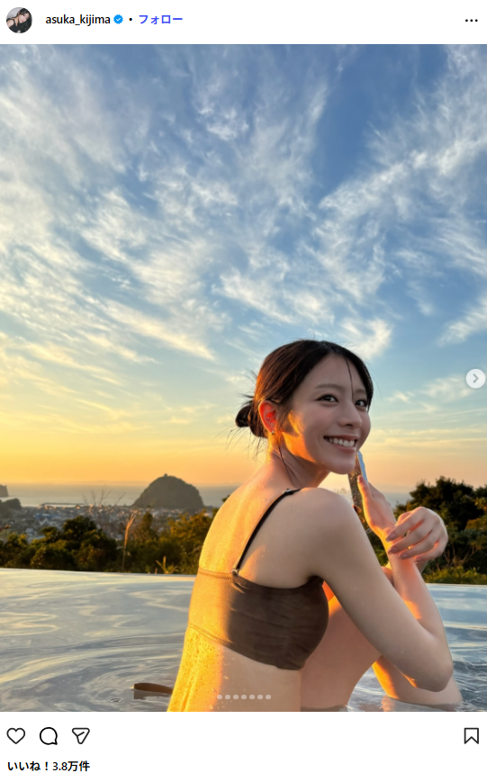 好きなお天気キャスターランキングで1位に輝き、モデル、女優、司会、ゲーム配信とマルチに活躍中の貴島明日香(29)が、2025年11月24日、自身の公式Instagramを更新。「オフの日に家族と一緒に千葉へ☺︎」「温水プールで最高に気持ちよかった〜」のコメントとともに、プライベートの水着ショットを投稿すると、3万件超の「いいね!」が寄せられていました。