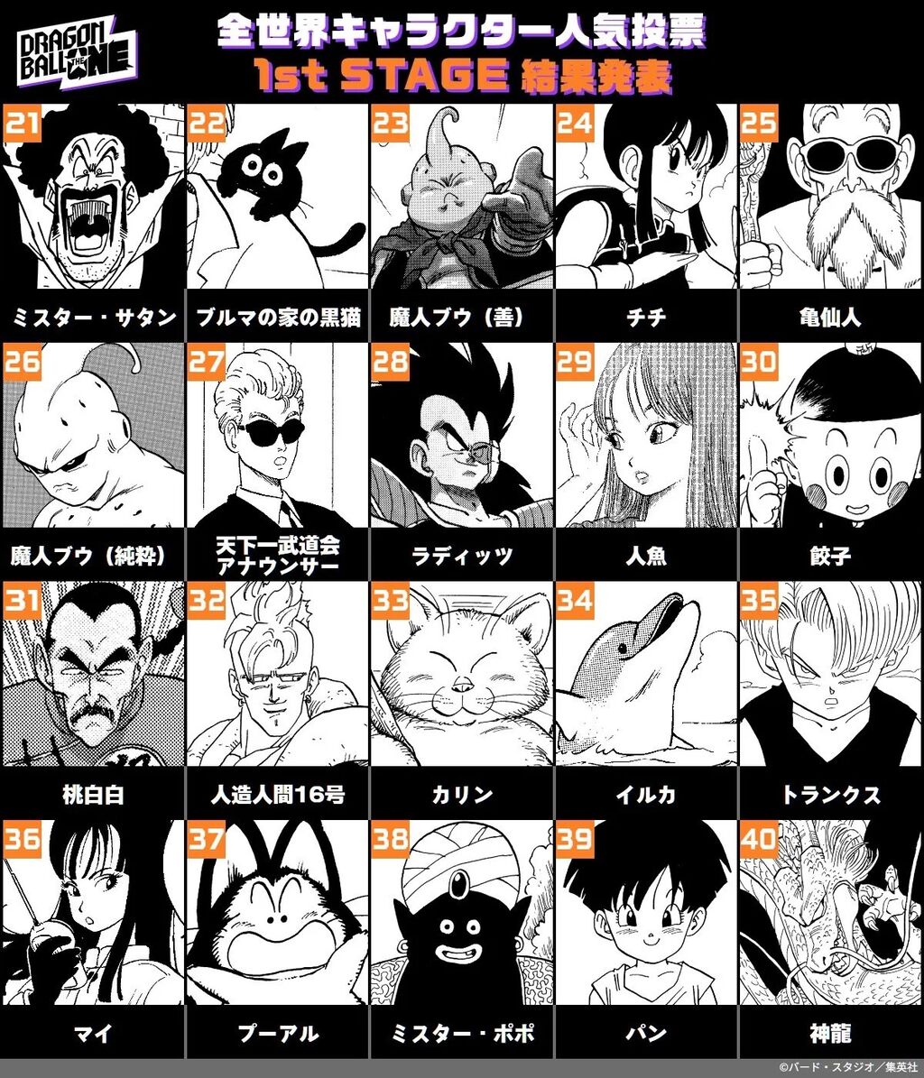 漫画『DRAGON BALL』(ドラゴンボール)初の全世界キャラクター人気投票「DRAGON BALL THE ONE」の1stステージの結果が発表された。1位は孫悟空、2位はベジータ、3位は孫悟飯、4位はベジット、5位はピッコロとなっている。