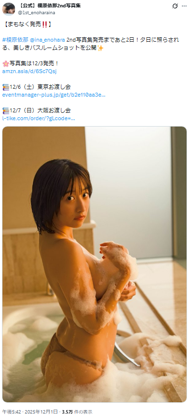 【画像】榎原依那さん、ヌード解禁wwwwwwww2nd写真集から泡ブラ&Tバックの衝撃カットが公開!!! グラビアアイドル・水着姿 X Facebook はてブ LINE コピー 2025.12.03 スポンサーリンク 大迫力ボディを武器に各誌の表紙を席巻するグラビアアイドル・榎原依那(えのはら・いな=28)が、2025年12月3日、2nd写真集「I am Ina」を発売します。 写真集の公式Xでは、バストトップを泡で隠した上半身ヌード&Tバックカットが解禁されました。 榎原依那のプロフィール、2nd写真集の先行カット&オフショット、前作1st写真集「Inaism」の画像をまとめました。 続きを読む