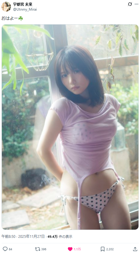 秋元康プロデュースのガールズバンド「ザ・コインロッカーズ」の元ボーカルで、オルタナティブ・ガールズユニット「月刊PAM」として活動中の宇都宮未来(みらい=22)が、2025年11月27日、自身の公式X(旧Twitter)を更新。「おはよー☘️」のコメントとともに、光が差し込む水着グラビアのオフショットを投稿すると、ビジュアル最高な1枚に称賛の声が殺到。1万件超の「いいね!」が寄せられていました。