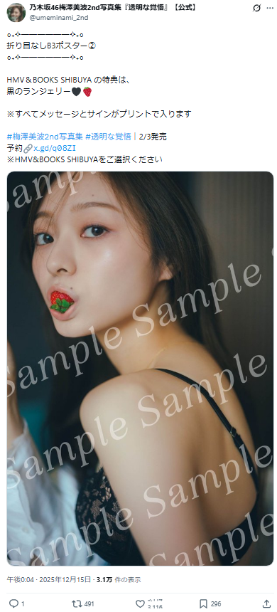 【下着画像】乃木坂46梅澤美波、黒ランジェリー姿を解禁wwwwww2nd写真集の購入特典21種類が大公開!!! 乃木坂46 X Facebook はてブ LINE コピー 2025.12.15 スポンサーリンク 乃木坂46のキャプテン・梅澤美波(26)が、2026年2月3日、2nd写真集『透明な覚悟』を光文社から発売します。 発売に先駆け、書店特典ポスター3種&ポストカード18種の絵柄が解禁され、初公開されたランジェリーカットにファンから興奮の声が殺到していました。 梅澤美波のプロフィール、2nd写真集の先行カット、2020年に発売した1st写真集「夢の近く」からランジェリー姿画像をまとめました。 続きを読む
