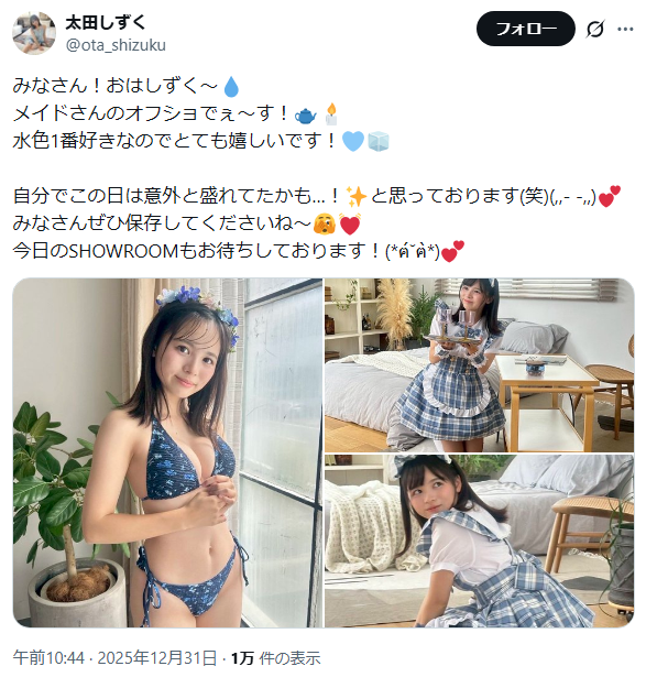 【画像】ミスマガジン受賞の16歳JK、水着グラビアが天使級に可愛すぎるwwwwww超絶美少女・太田しずく、メイド&ビキニでファンを悩殺!!! グラビアアイドル・水着姿 X Facebook はてブ LINE コピー 2026.01.11 スポンサーリンク 講談社主催のミス・グラビアコンテスト「ミスマガジン2025」で審査員特別賞を受賞した太田しずく(16)が、2025年12月31日、自身の公式X(旧Twitter)を更新。Webサイト「ヤンマガWeb」で披露したメイド&水着グラビアのオフショットを投稿すると、可愛くてスタイル抜群な姿にファンから歓喜の声が殺到していました。 太田しずくのプロフィール、メイド&水着グラビア画像をまとめました。 続きを読む