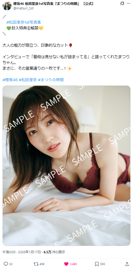 「ネプリーグ珍回答事件」で知られる櫻坂46のキャプテン・松田里奈(26)が、2026年1月20日、1st写真集「まつりの時間」を幻冬舎から発売します。