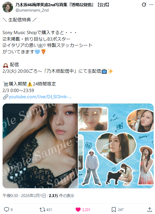 【画像】乃木坂46梅澤美波、超絶SEXYランジェリーでファンを悩殺wwww最新写真集の特典ポスターで大人の魅力爆発!!! 乃木坂46 X Facebook はてブ LINE コピー 2026.02.01 スポンサーリンク 乃木坂46のキャプテン・梅澤美波(26)が、2026年2月3日、2nd写真集『透明な覚悟』を光文社から発売します。 発売に先駆け、YouTube配信中にSony Music Shopで購入すると貰えるポスターの絵柄が公開されると、セクシーな黒ランジェリー姿の大人カットにファンから興奮の声が殺到していました。 梅澤美波のプロフィール、2nd写真集の先行カット、2020年に発売した1st写真集「夢の近く」からランジェリー姿画像をまとめました。 続きを読む