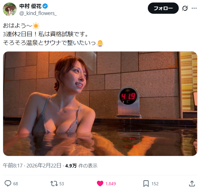 【画像】元SKE48中村優花アナ、水着姿の破壊力がヤバすぎるwwwwwグラビア映えする抜群のスタイルが反響!!! SKE48 X Facebook はてブ LINE コピー 2026.02.23 スポンサーリンク SKE48の元メンバーで、フリーアナウンサーやプロ雀士として活動する中村優花(28)が、2026年2月22日、自身の公式X(旧Twitter)を更新。「おはよう〜☀️3連休2日目!私は資格試験です。そろそろ温泉とサウナで整いたいっ🧖♀️」のコメントとともに、水着姿でグラビア映えする豊満なバストを見せた入浴写真を投稿すると、ファンから歓喜の声が寄せられていました。 中村優花のプロフィール、本人SNSから水着姿画像をまとめました。 続きを読む