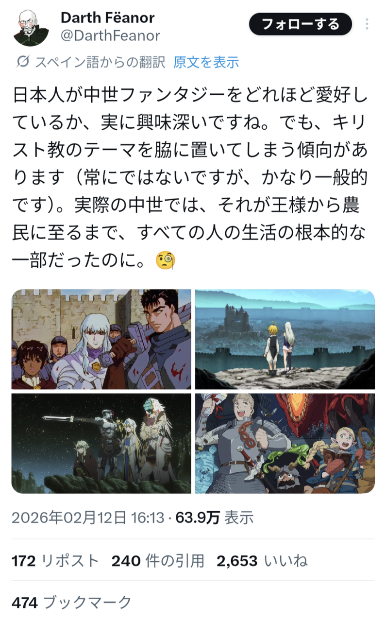 外国人「日本の『中世ファンタジー』にはキリスト教の要素が足りない」 人気マンガ X Facebook はてブ LINE コピー 2026.02.27 スポンサーリンク ベルセルク 43 1: 2026/02/13(金) 日本の中世ファンタジーにはキリスト教が足りないらしい知らんがなハゲ2: 2026/02/13(金) ベルセルクには教会めっちゃ出てきてた気がするけど…3: 2026/02/13(金) この物語はフィクションです4: 2026/02/13(金) ファンタジーってそういうものでしょ 続きを読む