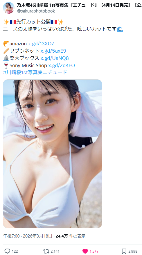 【水着画像】乃木坂46川﨑桜の隠れ巨乳にファン衝撃wwwww1st写真集から純白ビキニ姿カットが解禁!!! 乃木坂46 X Facebook はてブ LINE コピー 2026.03.18 スポンサーリンク 多才なメンバーが揃う乃木坂46の5期生の中でも、幼少期からフィギュアスケートの経験を持つ異色の存在・川﨑桜(22)が、2026年4月14日、ファースト写真集『エチュード』を新潮社から発売します。 発売に先駆け、純白のビキニ姿で豊満なバストを大胆に露出した先行カットが解禁され、ファンから興奮の声が殺到していました。 川﨑桜のプロフィール、1st写真集の先行カット画像などをまとめました。 続きを読む