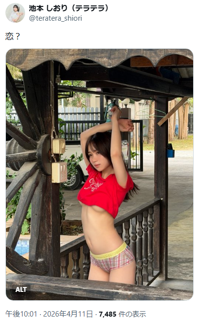「ミニグラ(ミニマム×グラマラスボディの略)」の超新星として注目を集める、アイドルグループ「テラテラ」の池本しおり(23歳=身長150cm=Fカップ)が、2026年4月11日、自身の公式X(旧Twitter)を更新。好評発売中の2nd写真集「ほんとのしおり。」から、超短いTシャツで下乳を大胆に露出したオフショットを投稿すると、ファンから興奮の声が殺到していました。