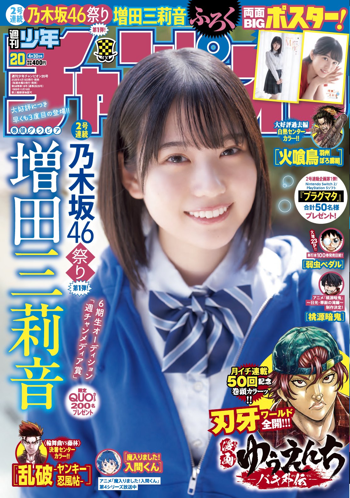 【画像】乃木坂46の16歳、可愛すぎてヤバいwwwww増田三莉音が「週刊少年チャンピオン」3度目の表紙&巻頭グラビア!! 乃木坂46 X Facebook はてブ LINE コピー 2026.04.16 スポンサーリンク 乃木坂46の6期生オーディションで「週刊少年チャンピオンメディア賞」を受賞した増田三莉音(みりね=16歳)が、2026年4月16日発売のマンガ誌「週刊少年チャンピオン」で、3度目の表紙&巻頭グラビアを飾りました。 グラビアでは、制服にパーカーを羽織った眩しい通学姿や、サロペットを着てプールを掃除するキュートなシーンまで、盛りだくさんとなっています。 増田三莉音のプロフィール、チャンピオンの最新グラビア、過去のチャンピオングラビア画像をまとめました。 続きを読む