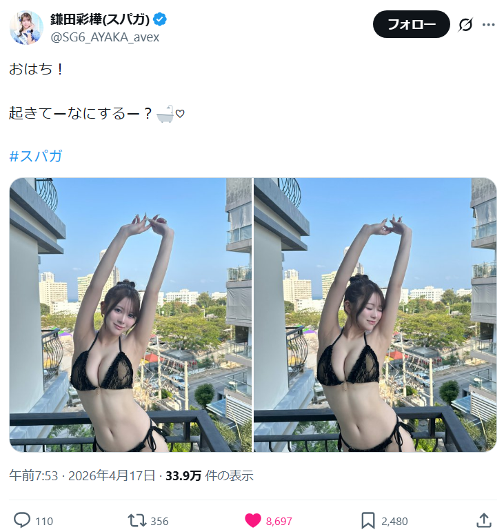 【ビキニ画像】カラダが仕上がりすぎwwwwwスパガ鎌田彩樺、最新水着ショットが芸術的スタイルすぎて大反響!!! SUPER☆GiRLS X Facebook はてブ LINE コピー 2026.04.18 スポンサーリンク アイドルグループ「SUPER☆GiRLS」のメンバー・鎌田彩樺(あやか=22)が、2026年4月17日、自身の公式X(旧Twitter)を更新。「おはち!起きてーなにするー?」のコメントとともに、ホテルで撮影されたビキニ姿の写真を投稿すると、スーパーなスタイルに称賛の声が殺到していました。 鎌田彩樺のプロフィール、最新ビキニショット、ヤンマガの水着グラビア画像をまとめました。 続きを読む