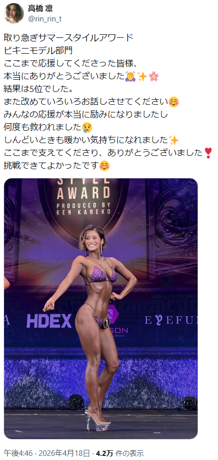 35歳を迎えた今もグラビア界の第一線で活躍を続け、女性専用のパーソナルトレーナーとして「CHANCE GYM新宿店」に勤務する高橋凛(35歳Iカップ)が、2026年4月18日、自身の公式X(旧Twitter)を更新。夏が似合う筋肉美を競う人気ボディコンテスト「サマー・スタイル・アワード」ビキニモデル部門で5位入賞したことを明かし、ポーズを取った写真を投稿すると、驚異の美ボディに称賛の声が殺到していました。