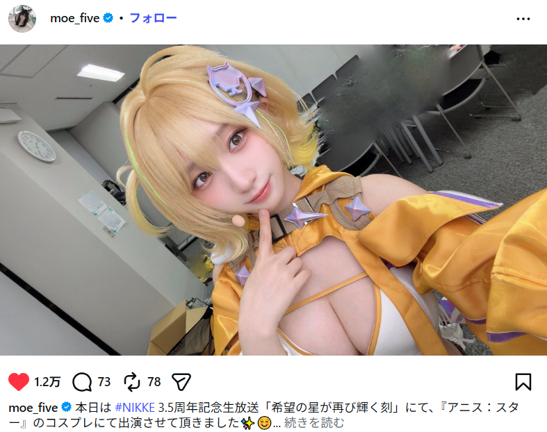 総SNSフォロワー数500万人超の日本が誇るトップコスプレイヤー・伊織もえ(33歳Hカップ)が、2026年4月18日、自身の公式X(旧Twitter)を更新。スマートフォンゲーム「NIKKE」の3.5周年記念生放送イベント「希望の星が再び輝く刻」にコスプレにて出演したことを明かし、ゲーム内キャラクター『アニス:スター』に扮したコスチューム姿の自撮り写真を投稿すると、ファンから歓喜の声が殺到していました。
