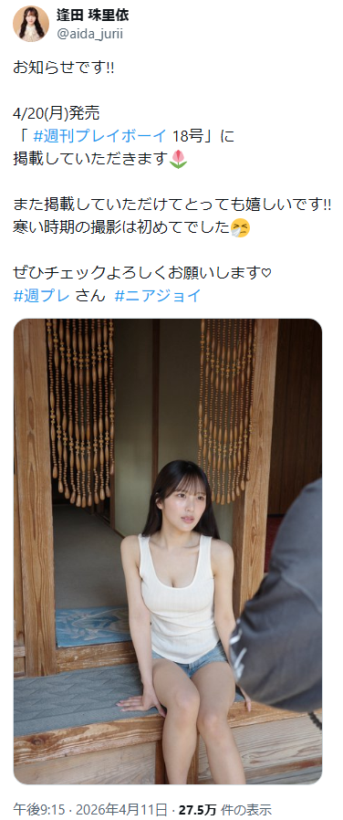 指原莉乃プロデュースのアイドルグループ「≒JOY」のメンバーで、“国宝級スタイル美少女”こと逢田珠里依(あいだ じゅりい=20)が、2026年4月20日発売の雑誌「週刊プレイボーイ」で、水着グラビアを披露することがわかりました。