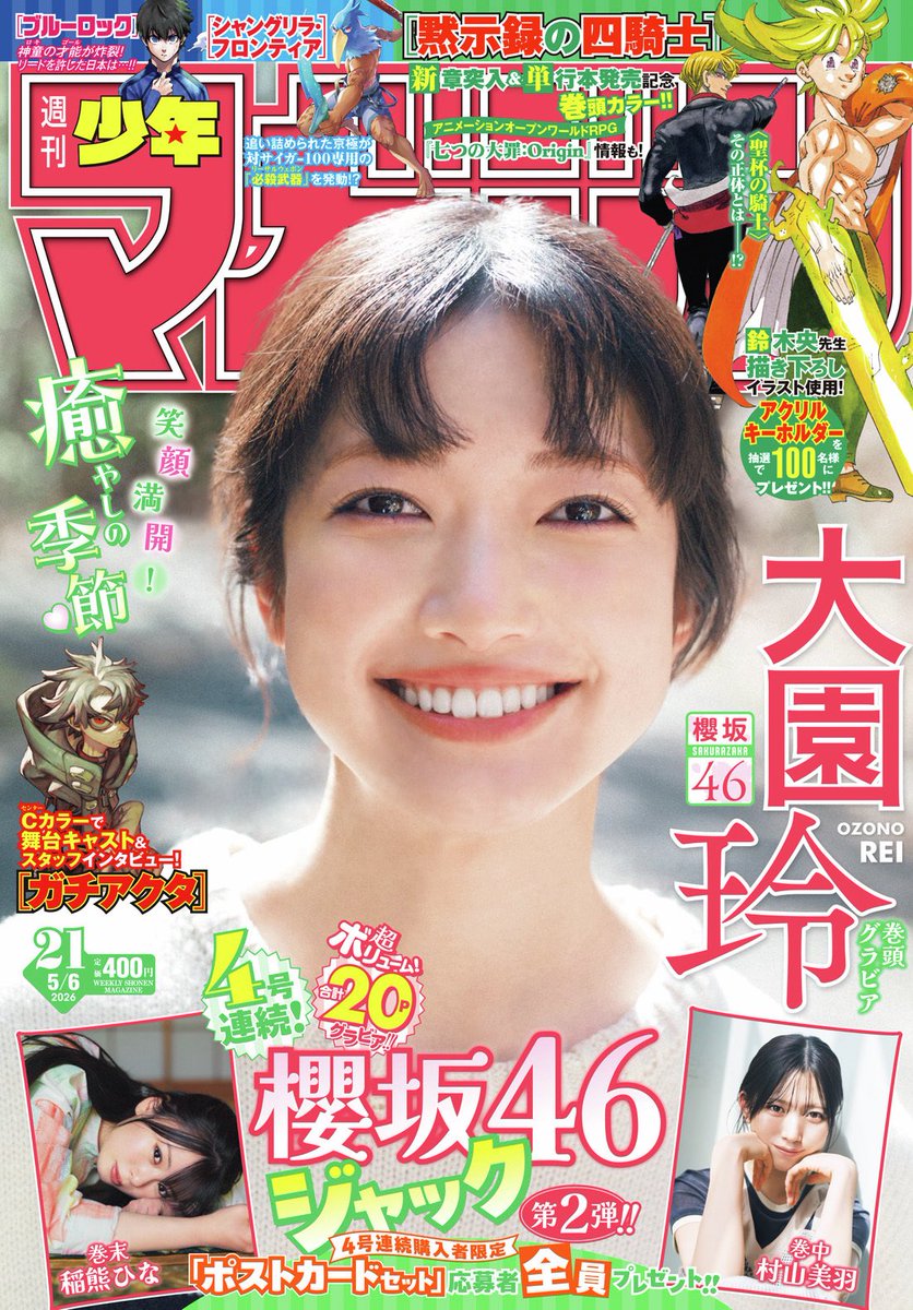 櫻坂46の大園玲(26)が、2026年4月22日発売のマンガ誌「週刊少年マガジン」で、表紙&巻頭グラビアを飾りました。