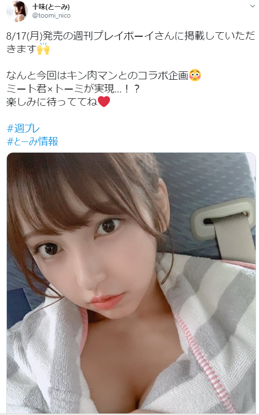 十味、「ミート君×とーみ」グラビア画像が衝撃すぎた 週刊プレイボーイでキン肉マンキャラと奇跡のコラボ! グラビアアイドル・水着姿 X Facebook はてブ LINE コピー 2020.08.16 スポンサーリンク “平成最後の奇跡の原石”としてデビューしたタレントの十味(とーみ=21歳)が、2020年8月17日発売の『週刊プレイボーイ』で、漫画『キン肉マン』のキャラクター・ミートくんとコラボしたグラビアを披露することがわかりました。 発売に先駆け、週刊プレイボーイの公式サイトでは先行カットが公開され、かなりの衝撃が走ったので、そちらの画像などをまとめました。 続きを読む
