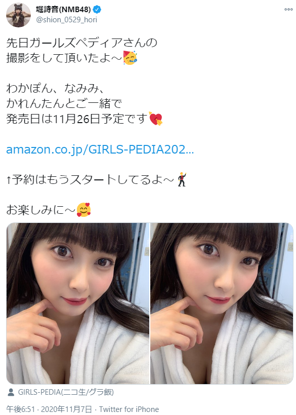 NMB48の堀詩音(24)が、2020年11月7日、自身のTwitterを更新。11月26日に発売されるグラビア雑誌『GIRLS-PEDIA2020 AUTUMN』のオフショット写真を投稿したところ、水着の上にガウンを着たセクシーショットに絶賛の声が寄せられていました。