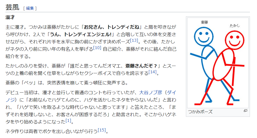 wikipedia「トレンディエンジェルの漫才説明したいけど、字だけじゃ伝えにくいなぁ・・・せやっ!」