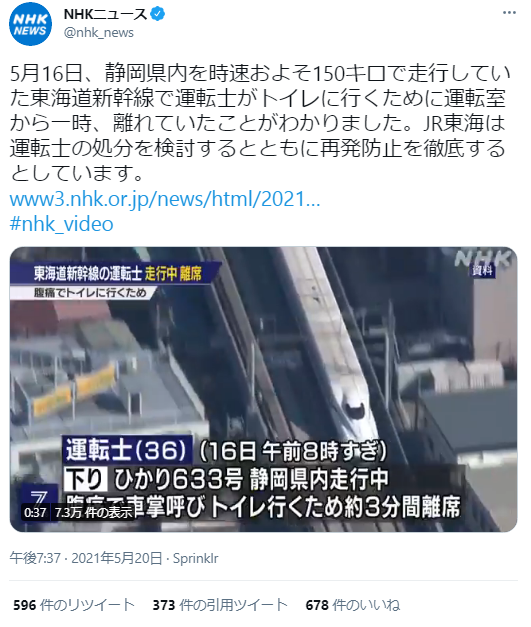 2021年5月20日、JR東海は、東海道新幹線の運転士が16日に静岡県内を走行中、トイレに行くため3分22秒間、運転室を離れていたと発表しました。その間、運転資格のない車掌しか運転室にいない状態で、時速約150キロで走行したという。
